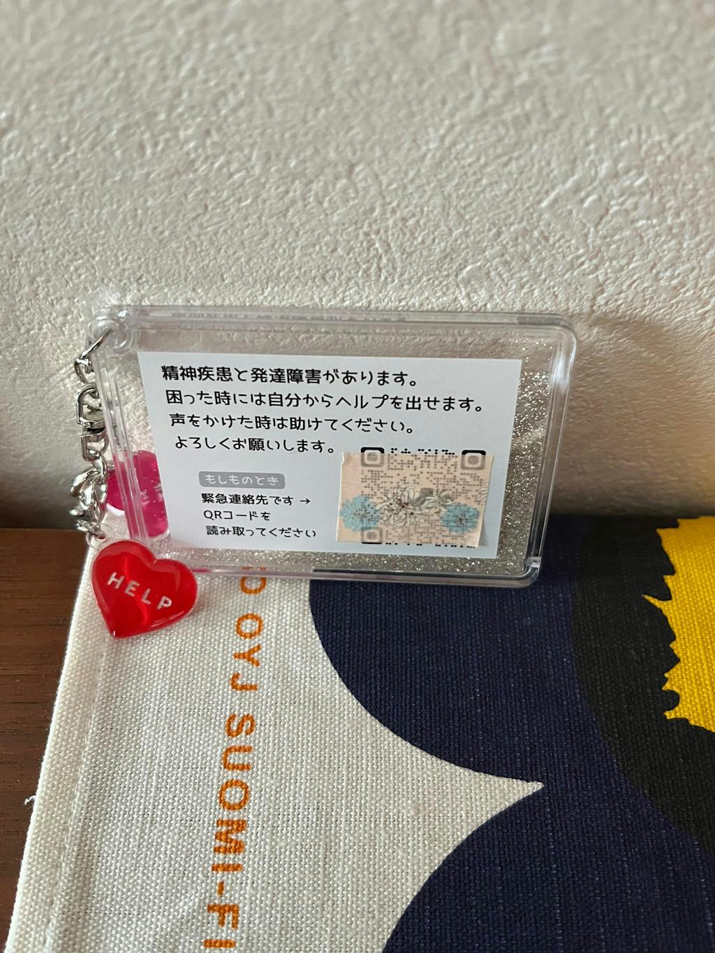 子どもがとても気に入っており、早速使っています。また、役所などでヘルプマークと一緒にいただく連絡カードに少し、今の時代書いて使うことに悩んでいたところ、いつも購入させていただいているこちらのショップに素晴らしいアイデアのおまもりチャームの販売を知り、しばらくは秒で完売が続いていたのでタイミングの合う今回は購入させていただきました。ありがとうございます。カバンを2つでまわしているので、少しずつ増やしていきたいなと思っています。絵カードも使っています。